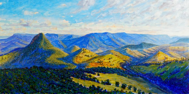 The Three Sisters at Echo Point in Katoomba NSW is a major tourist attraction and has been since thee mid 19th century. I hesitated to make a painting of this because it has been done so many times by other artists but its a great subject so I found my own way into it. The things that I felt were important were the combination of solidity of the rock formations and also their temporality. They resist and yet they are slowly dissolving before our eyes in a geological timeframe, like sandcastles on a beach. They stand in apparent defiance before the void that will eventually swallow them up. I gave them a chunky, blocklike appearance to empathise the crystalline structure of the quartz that makes up the sandstone that was laid down as the bed of an ancient sea, only to be lifted up, drained and eroded over the millions of years that followed. When I was making this work I became aware that the Sisters resembled Picasso’s women in the painting that gave me an idea for the joke title.