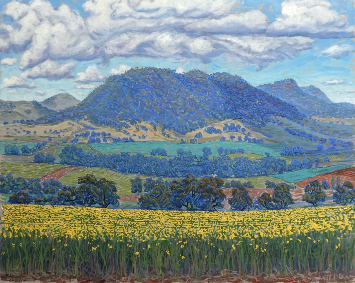 Near Woodstock NSW, a big blue hill looms over various crops including canola.