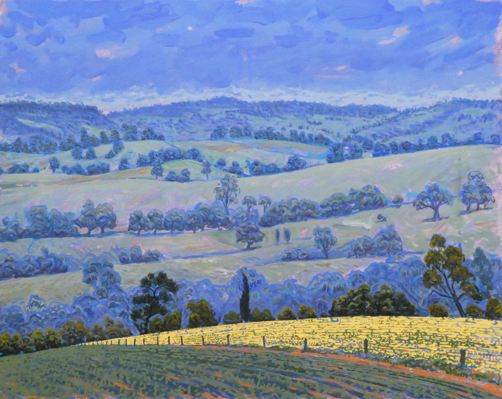 Canola crops are impossible to ignore around Cowra. On a hazy day, when the landscape takes on a blue hue, the Canola makes a statement.