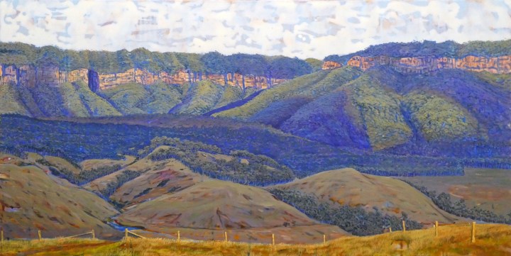 It depicts the Canola crops, hills, and a wind farm in central western NSW, as a storm front approaches.